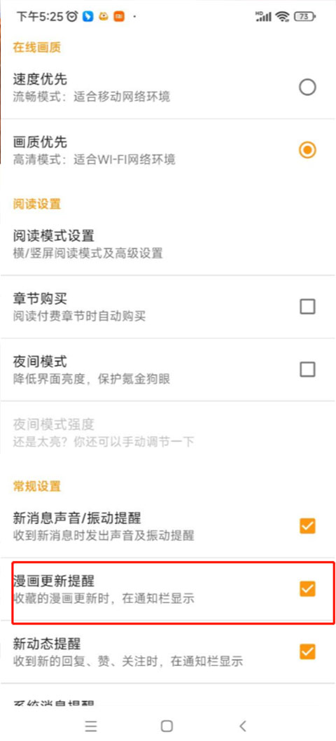 4、勾选【漫画更新提醒】就完成了。