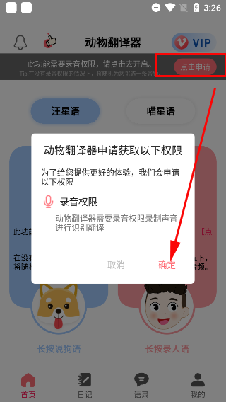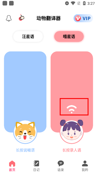 2、在人语框中长按即可录取声音,松开后则会自动翻译成“瞄星语”或“汪星语”,并且自动播放出来。相反的,录制狗狗或猫猫的录音也可将意思翻译成中文