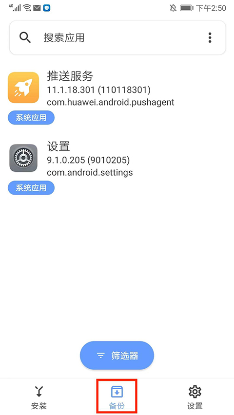 8、进入备份界面,可搜索相应的应用或者使用筛选器进行应用备份,