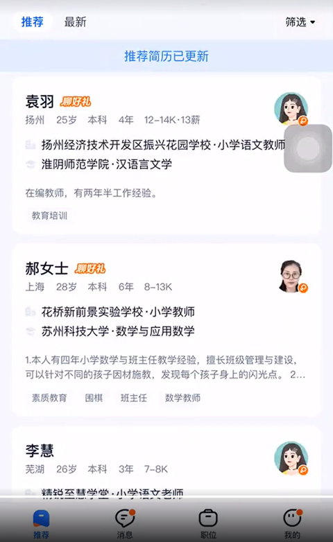 7、用户可以前往推荐页面中,查看平台智能推荐的人才简历