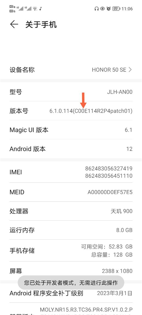 2、进入手机设置选项,找到手机版本号,然后连续点击进入到开发者模式中。
