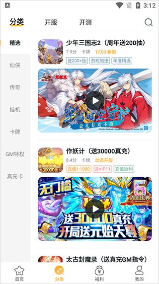 3、其次分类界面包括了精选、仙侠、传奇、挂机、卡牌、GM特权、真充卡等板块;