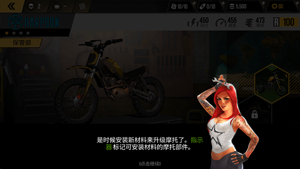 6、完成了任务后是时候安装新材料来升级摩托了。指示器标记可安装材料的摩托部件。你的摩托现在有更多的动力,你可以把它带到新的地平线!