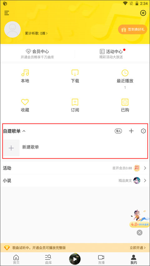 1、从【首页】切换到【我的】界面,在自建歌单中点击新建歌单。