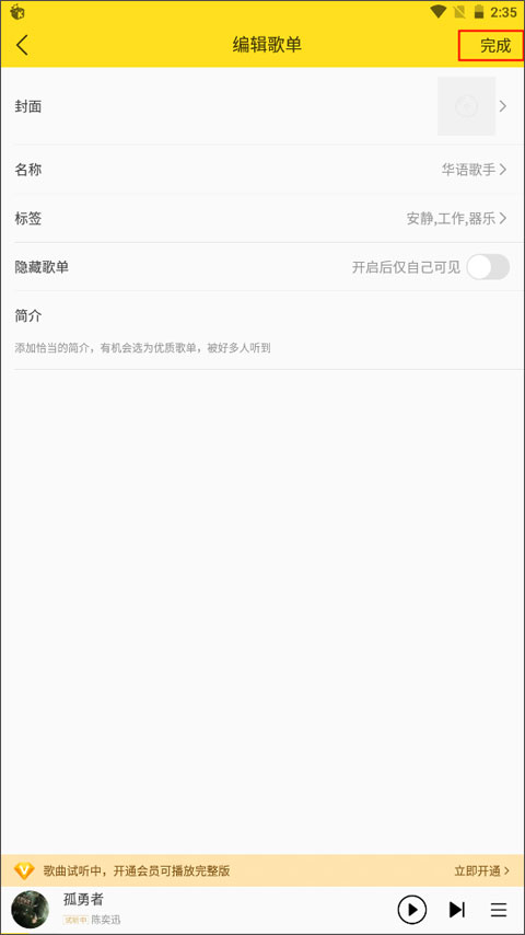 3、下面就是开始编辑歌单的封面和标签,如果想自己查看歌单也可以隐藏歌单,最后点击完成按钮就可以创建好歌单了。