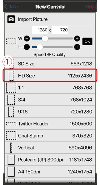 3、SD 大小是一个小画布, 和 HD 大小是一个大画布。大小 (像素数和分辨率) 将取决于您的设备。还将显示最大层数。这个数字也取决于您的设备。点击①HD 大小。