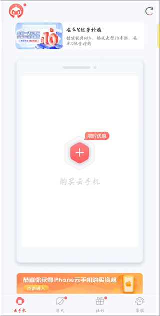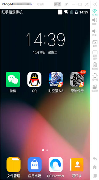 2、点击主界面中间的“+”号,添加一台云手机后,点击云手机列表中的云手机页面,即可进入红手指云手机平台。