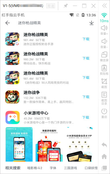 3、在红手指云手机桌面打开云游戏应用市场,搜索“迷你枪战精英”并选择自己玩的客户端版本,即可一键下载安装【迷你枪战精英】。