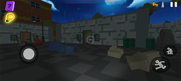 3、进入一个陌生的地方,到处都透露着废弃和被烧毁,左下角按钮控制移动观察四周,右侧是下蹲潜行和奔跑;