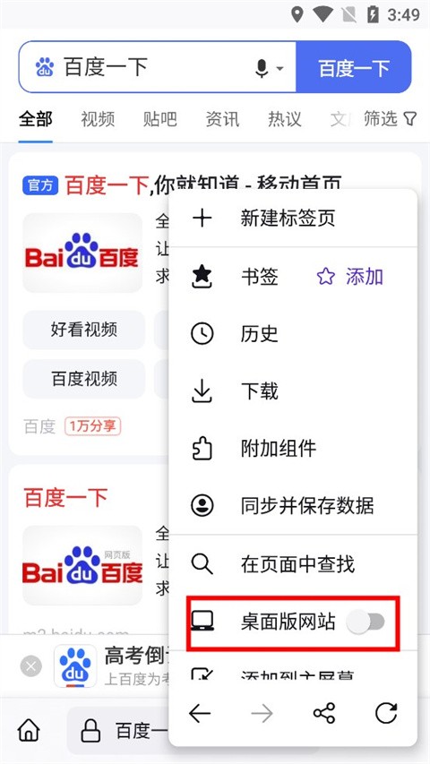 1、 首先我们进入火狐浏览器安卓版当中,然后在搜索处搜索自己的需求,小编这里以百度为例;