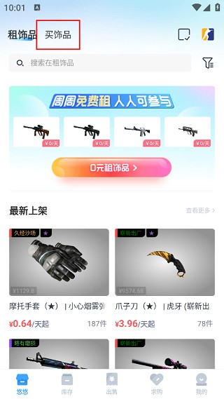 1、首先在本站下载安装软件并打开,来到主页面之后,可以看到这里提供了大量的游戏道具饰品可以进行租或者购买,我们需要点击上方中的“买饰品”选项。