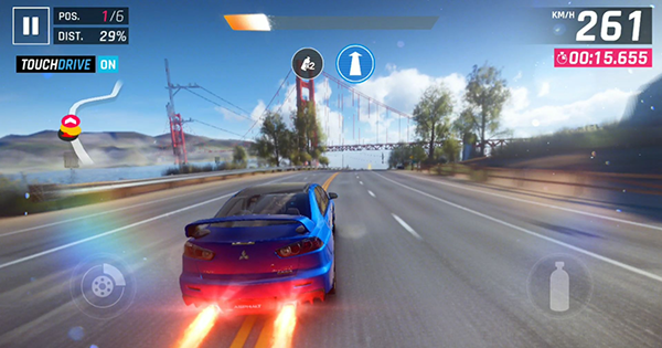 2、独特的驾驶物理引擎,考验玩家的操作技巧,巧妙运用手刹、Nitro加速等技能决胜千里;