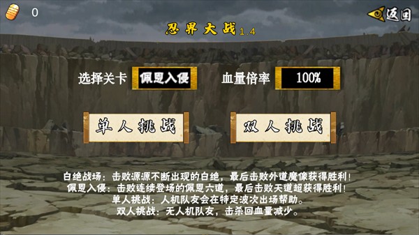 核心玩法:分白绝战场和佩恩入侵两大关卡,支持单人挑战和双人挑战,可调整血量倍率。