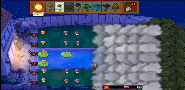 4、大家可以看到此版本与其他版本有很大的不同,上面有一层云遮挡,所以你不知道对面来了多少僵尸,可以说非常的刺激。