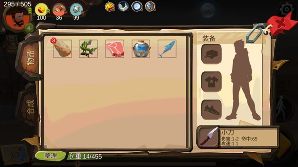 由于角色拥有饥饿和口渴数值,也就必然拥有食物与饮料。要与敌人战斗,也自然拥有装备物品。再加上合成必须的零件,所以玩家能够收集到的物品也就是三大类:食物、零件、装备。