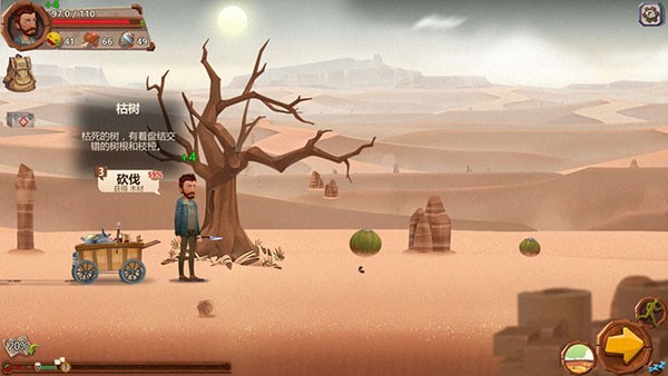 第一张是沙漠,最难的一张,活过沙漠难度就直线下降了。沙漠路障多,金属材料资源少,很难做出二级武器。沙漠有四个分支,第一是村庄,跟村长交流加乞讨就行了。