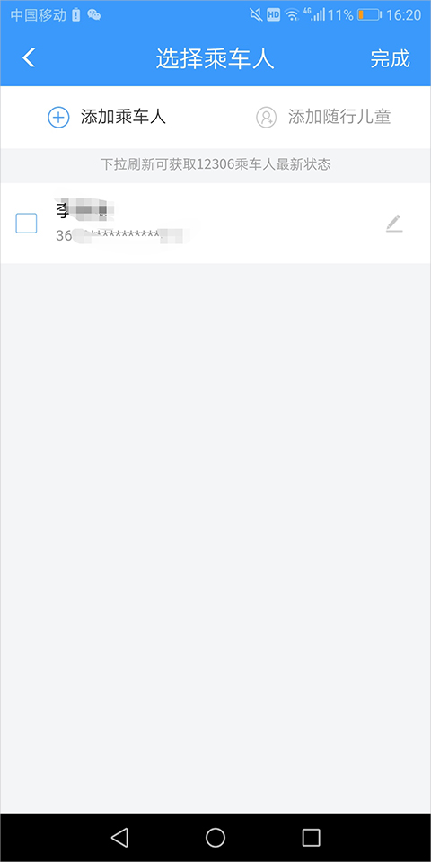 4、在打开的【选择乘车人】页面中,可以选择一个乘车人