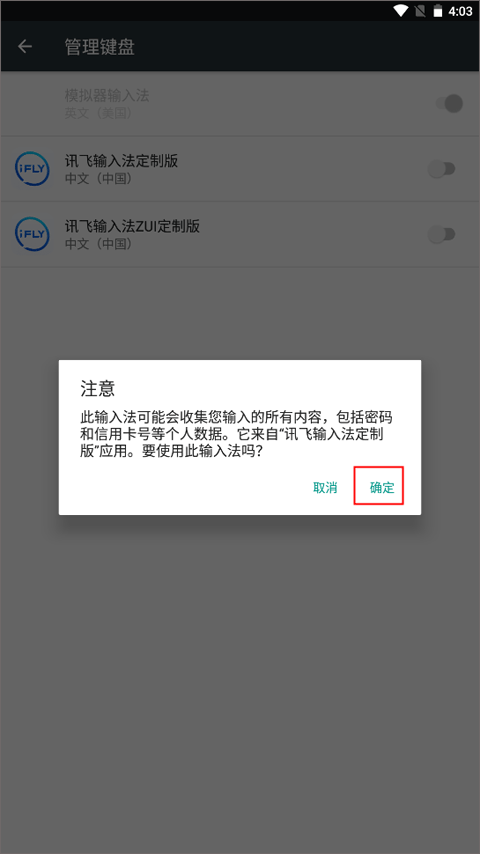 3、将讯飞输入法oppo定制版右边的按钮开启,呈现出绿色状态,并根据注意再次点击确定按钮。