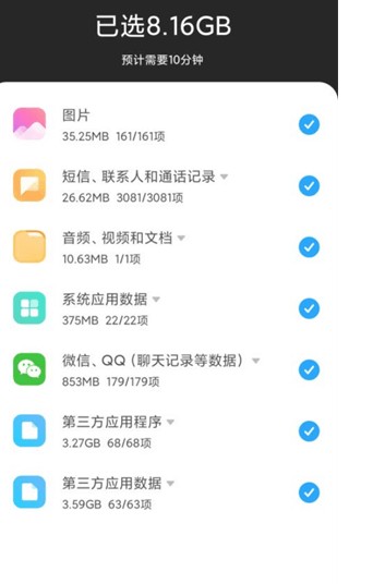 3、包括图片、联系人、短信、通话记录、视频、文档、系统应用程序设置。