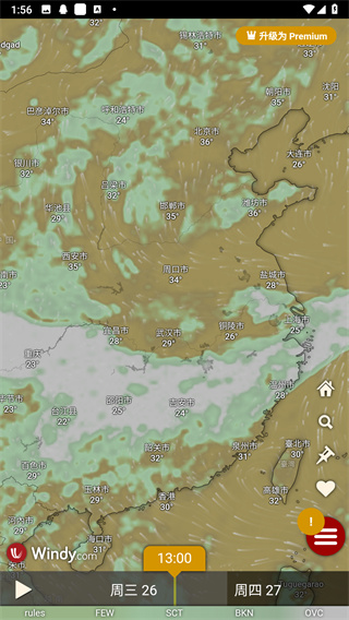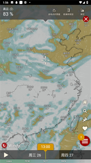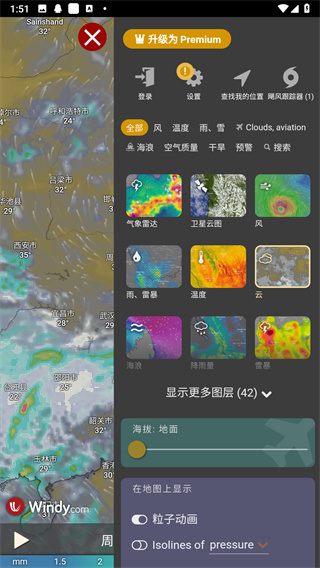 在windy app中包含了高云、中云、低云等不同的图层,在点选不通风的图层的时候就能看到不同云分布的区域。