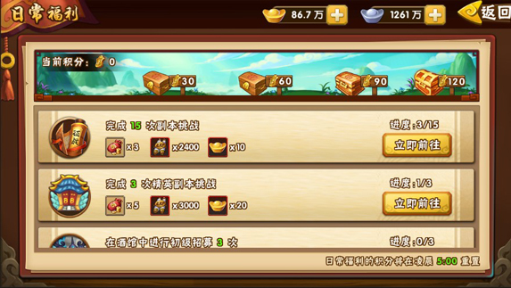 挑战剧情副本,可以获得大量的资源,包括武将经验,银两,武将碎片,装备碎片和进阶用的护脉丹。前期剧情副本难度不高,每日每关都重置,每关可扫荡5次。固定获得最基础的资源,每天上线后记得尽早打晚。