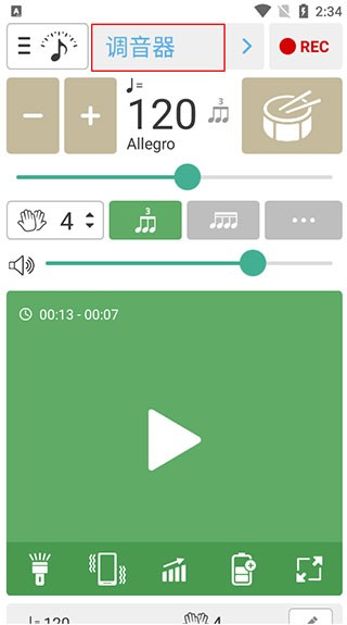 1、打开软件后为节拍器,点击上方“调音器”三个字进入调音器。