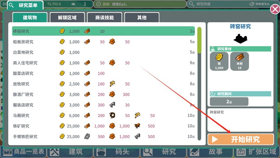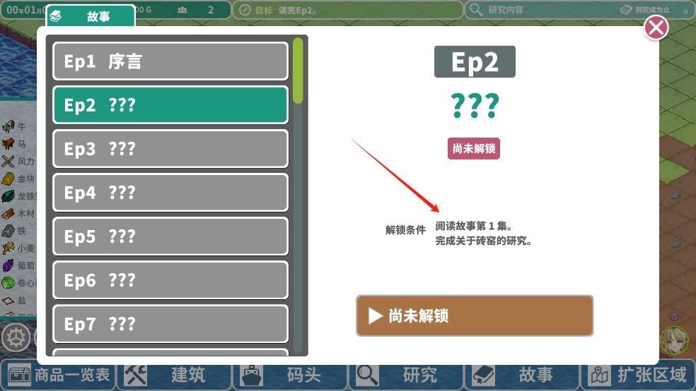 2、新手玩家先跟着故事推进游戏,如:完成关于砖窑的研究