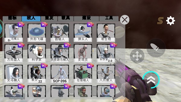 3、点击左侧箱子按钮,玩家可选择要添加的敌人,如马桶人、圆锯人、弹头人、寄生物、外星飞碟等;