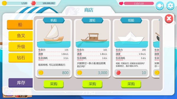 5、金币可用来购买船、鱼叉、升级装备等;