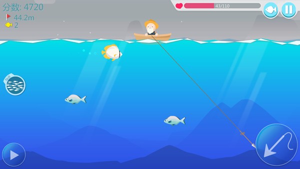 2、然后点击开始,游戏内如图,玩家需在合适的时机点击屏幕抛出钩子捕鱼;