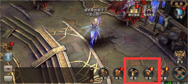 在屏幕的右下角的功能菜单里,有锻造和技能两个选项。锻造菜单可以提升角色外在的装备,技能菜单是对角色现行使用的技能进行升级,要注意的是技能的级别不能高于角色的级别。如图片中角色的技能是30级,则其技能最高也只能达到30级。