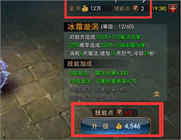 点击技能菜单后,花费金币和技能点进行技能的升级,技能级别越高所需要的技能点和金币越高,技能点不够时可以用钻石进行购买,每天购买次数有限。