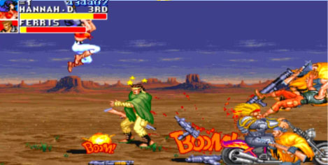 角色二:汉娜·邓迪 身高:170公分; 体重:53公斤; 身份:外交家兼冒险家。长发披肩,身穿红上衣白裤子。跑动中用膝盖攻击敌人腹部,跳跃中用脚攻击敌人。绝招是旋风脚。攻击力弱,但是速度快,使用武器最好,不擅长对空(对付翼龙和会飞的BOSS得小心了),属于敏捷型。