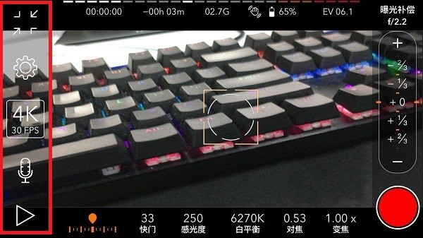 3、进入后有缩放屏幕、设置、4k30fps、录音和播放。