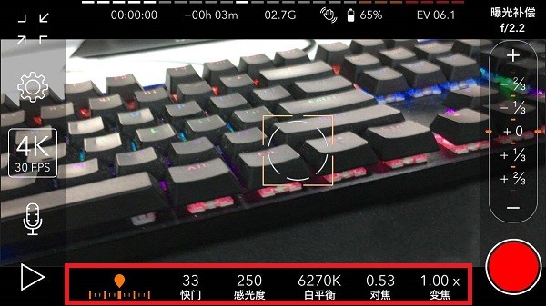 4、在下面一栏中,可以更改快门、感光、白平衡、对焦、变焦等参数。