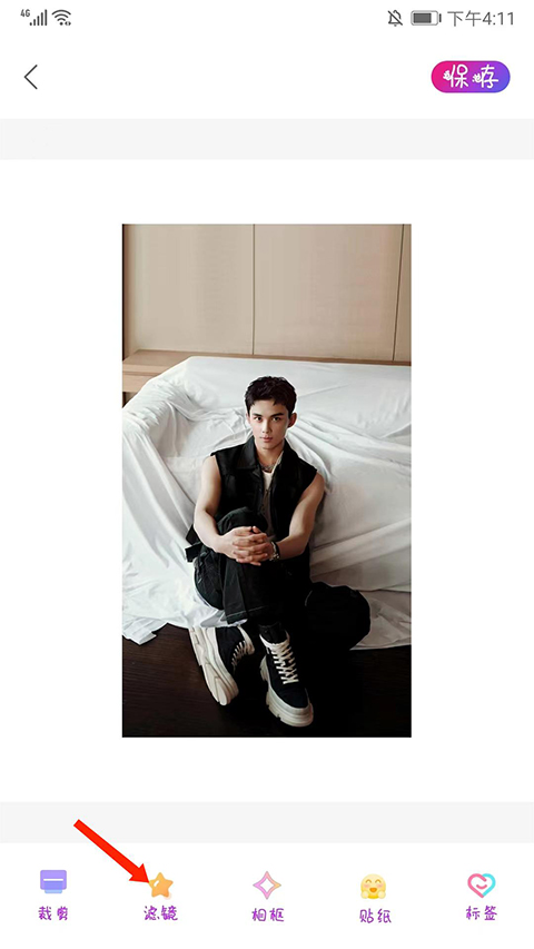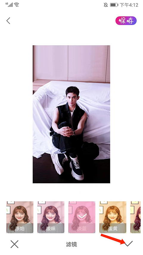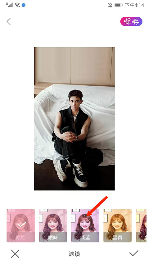 3、选择下方【滤镜】选项,滑动底部,可看到包括原始、暧昧、淡蓝、蛋黄等不同风格的滤镜,我们选择【淡蓝】,