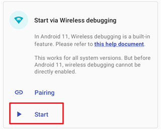 通过无线调试启动适用于 Android 11 或以上版本。这种启动方式无需连接电脑。由于系统限制,每次重新启动后都需要再次进行启动步骤。