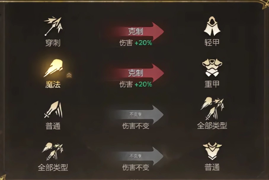 2、查看关卡内的怪物信息,构筑更合理的挑战阵容。如关卡内的怪物大多是重型护甲,我们可以选择上阵更多的魔法输出英雄,具体克制关系如图所示。