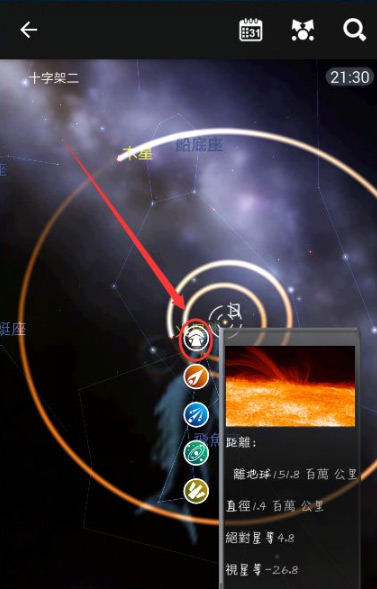 我们还可以在恒星资料左侧点击第一个图标(下图红色箭头所指)这时点击这个图标是可以登录到太阳上的,登录的距离也会计算出的