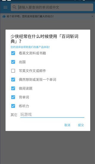 许久未见甚是想念,如果你也想我,来1. 微博上找百词斩;2. 百词斩词典侧边栏-反馈 ,聊天儿or吐槽or报错都可以不要害羞!
