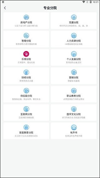 具体的使用可根据自身需求进行选择,如“专业分院”提供了房地产、党建分院、管理分院、人力资源分院、个人发展分院、财经分院、供应链分院、互联网、营销…职业教育等等,在每一个分院里都有对应的专业课程和知识解答。