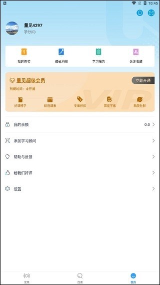 4、最后,关于“我的”,在这里你可以查看自己的购买课程内容,也可以查询自己的余额,亦或者添加学习顾问,设置个人偏好。