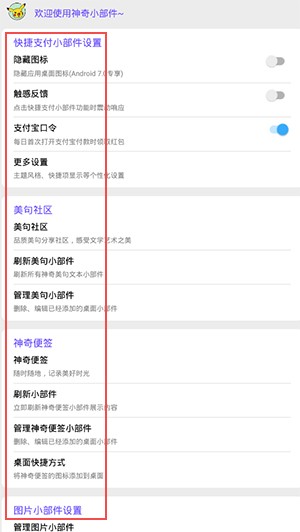 1、在本站下载安装神奇小部件app,运行软件,可以看到有快捷支付小部件设置、美句社区、神奇便签、图片小部件设置等;