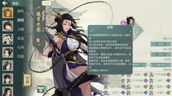 四技能会让对面给我们叠加减益时叠盾,很克制八门遁甲,因为比较肉,作为通玄位时就不是很适合恒山,非常适合刀魔铁石不器等剑意门派,八门遁甲有时为了以抢代ban也会使用白衣通玄。
