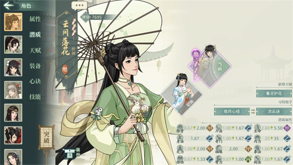 四技能开出后可以为队友免疫真伤,但是免疫不了藏渊的真伤,还能为能为身边队友叠加专注和攻击强化buff,非常实用,潜能天赋是在场上有除自己外其它三个女侠客(不分敌我)时获得集气加成,我没记错的话满突后能加0.46集气,2.5集气对桃花非常重要,可以让小桃花40时序加一次盾,所以这个潜能天赋对桃花来说也很实用。一般穿如梦套,其实作为通玄位桃花什么门派都可以用,不过自身技能组更加契合剑魂门派。