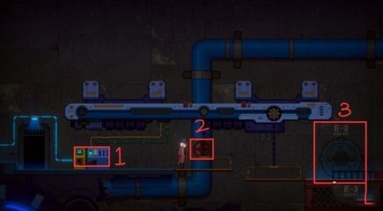 2、电流接通后,启动下图的控制台【1】,升降台会抬起,把升降台上的红色阀门【2】转动,引出水流。可以顺路进入最右侧【3】的E-3门中获得【遗落的机器人笔记】。