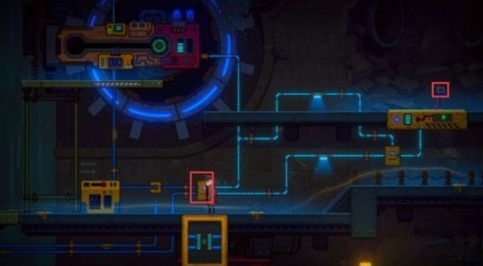 3、一路往下,按下图转动水车下方的电分流器,使电路与下图中的一致。然后到右侧,按下升降台的红色按钮,升降台浮起。