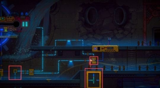 9、回到水车附近后,调整沿途两个方框中的电分流器,使电路流动与下图一致。最后按下左边的控制台,使水车完全运转。