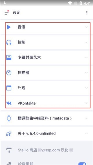 4、在“设定”中可以对:音讯、控制、专辑封面艺术、扫描器、外观等进行设置;