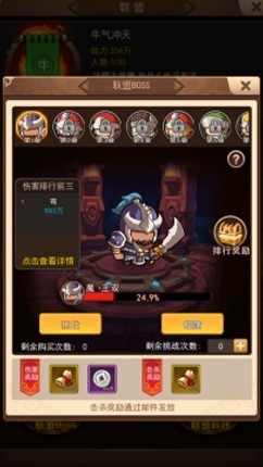 简单而言是专属于联盟的副本。在这里,联盟成员可以一起对boss发起进攻,直到boss血量为0则为胜利。每次挑战boss都可以获得丰富的贡献值和银币。系统会对boss的伤害会进行排名,排名前五十的都在boss击败后会获得不同的奖励。顺带一提,最后一步击杀boss的玩家可以获得额外奖励。